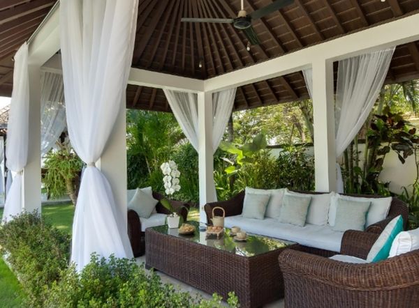 Кроме подушек к месту придутся и шторы, которые скроют от света и от дождя всех, кто захочет разместиться на террасе или в беседке. Здесь тоже лучше использовать «уличную» ткань. Она устойчива и к выгоранию, и к влаге. Только надо учитывать, что ткань с дополнительной прослойкой из ПВХ следует направлять текстильной стороной к солнцу, а швы при изготовлении мебели желательно проклеивать. Дело в том, что слой из ПВХ на солнце может пожелтеть, поэтому его лучше направлять внутрь помещения.